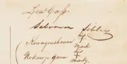 Keewaycooshcum's agreement to the terms of the 1821 treaty substantially hurt his prestige with the Grand River Ottawa. While he had been among the most powerful Ottawa leaders prior to the treaty, by 1835, he had been exiled from the Flat River to the Manistee River far to the north, the furthest possible outlands of Grand River society.[5] When the Grand River Ottawa signed a second treaty with the United States in 1836, Keewaycooshcum was singled out with the diminutive title "former head chief," and designated as a "2nd Class" leader.[6]