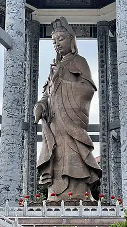 In 2002, a 30.2-metre (99 ft) bronze statue of Guanyin, the Goddess of Mercy, was completed and opened to the public. It replaced the previous white plaster Kuan Yin statue which was damaged due to a fire a few years earlier. The bronze statue is located on the hillside above the pagoda. The statue is complemented with a 60.9 metres (200 ft) three-tiered roof pavilion (with 16 columns made of bronze supporting the pavilion),[5] which was completed in 2009.[11] At the time of completion, it was the second tallest Guanyin statue in the world.[12] One hundred statues of the goddess Kuan Yin, each of 2 metres (6 ft 7 in) height, are set around the main statue of the goddess. However, its height was restricted to avoid its shadow falling on the Penang State Mosque.[13] This shrine also has other 10,000 statues of Buddha, apart from a statue of 12 Zodiac Animal Signs of the Chinese Calendar.[5]