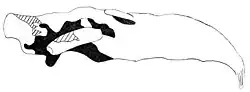 Prior to the discovery of Kelenken, the skulls of incompletely known large phorusrhacids were reconstructed as scaled up versions of those of smaller, more complete relatives like Psilopterus and Patagornis, as exemplified by a frequently reproduced 1895 sketch of the destroyed skull of the large Phorusrhacos, which was itself based on that of Patagornis. These reconstructions highlighted their assumed very tall beaks, round, high eye sockets, and vaulted braincases, but Kelenken demonstrated the significant difference between the skulls of large and small members of the group.[3][4] The holotype skull is very massive, and triangular when viewed from above, with the hind portion compressed from top to bottom. The upper beak is very long, exceeding half the total length of the skull, unlike in Mesembriornis and Patagornis, and is longer than that of Phorusrhacos. The ratio between the upper beak and the skull of Kelenken is 0.56, based on the distance between the bony nostril and the front tip. In spite of the crushing from top to bottom, the upper beak is high and very robust, though apparently not as high as in patagornithines, such as Patagornis, Andrewsornis and Andalgalornis.[3]