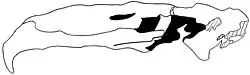 The frontal bones appear to have been flat on their upper side. The area where the frontals would have contacted the premaxillae is damaged so that their sutures (joints between them) cannot be identified, but the sutures between the frontals and the nasals and parietals are fully fused. This fusion makes it difficult to identify how these bones were part of the skull roof, but the blunt, robust postorbital processes were probably mainly formed by the frontals. On their lower sides, each frontal forms a large depression where a jaw muscle attached. The postorbital process is separated narrowly from a robust zygomatic process, and these two projections enclose a narrow temporal fossa (opening at the temple). The postorbital process contains scars left by massive jaw muscles, parts of which invaded most of the skull roof at the level of the parietal bones. There is a well developed depression behind the zygomatic process, along the side of the squamosal bone, which corresponds to a jaw closing muscle. The subtemporal fossa further behind is broad and its back is defined by a blunt, sidewards extension of the nuchal crest.[3]