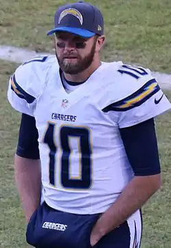 Clemens signed a two-year contract with the San Diego Chargers on March 13, 2014.[45] In the 2014 season, he only appeared in two games and completed one pass for 10 yards.[46] Clemens threw his first touchdown as a Charger on September 27, 2015, a 19-yard pass to Keenan Allen against the Minnesota Vikings.[47][48]
