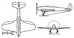The 28VD was a low wing, cantilever monoplane. Its wing span was small (6.65 m (21 ft 10 in); a wing area large enough to keep the wing loading to values comparable to those of World War II fighter aircraft designed a few years later produced an aspect ratio of only 4.2. In plan the wing was carefully faired into the fuselage and had a swept, straight leading edge, rounded tips and a curved trailing edge entirely occupied by ailerons. There were two spars, one perpendicular to the fuselage at mid-chord and one at an angle bearing the ailerons.[3]