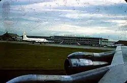The view of Kemayoran Airport from a Qantas Boeing 707 while an Aeroflot Ilyushin Il-18 rests at one of the terminals.