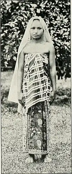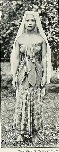 In the Malay Peninsula, kemban is essentially a type of sarong and was a very popular style of clothing prior to the prevalence of Baju Kurung and Baju Kebaya in Malaysia. The members of the nobility used better quality and designed cloths, as well as elaborate jewelry made of gold and precious stones.[6] They had their kain kelubung (shawl) to cover their heads from the sun and a kain kemban worn from the bust downwards to keep them cool in the tropical heat. According to the Malay Annals, Sultan Mansur Shah, the sixth Malaccan ruler, banned Malay women from wearing only a kemban as it ran contrary to personal modesty based on Islamic teachings.[7] Today, the kemban torso wrap is rarely worn in the piously Islamic Malay community of Malaysia, regarded as a relic of the past, replaced by the more modest Baju Kurung which is generally worn with tudong to comply with Islamic modesty requirements.