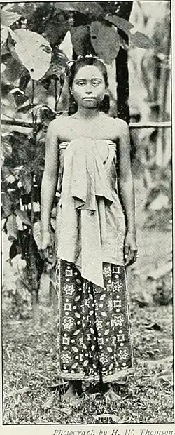 Kemben (Javanese: ꦏꦼꦩ꧀ꦧꦼꦤ꧀, Indonesian: kemban) is an Indonesian female torso wrap historically common in Java, Bali, and other parts of the Indonesian archipelago. It is made by wrapping a piece of kain (clothes), either plain, batik printed, velvet, or any type of fabrics, covering the chest wrapped around the woman's torso.[3]