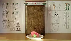 This worship generally takes the form of prayer, offerings, and setting up altars.[27] Altars are most often constructed using a statue or two-dimensional representation of one or more given deities, as they serve as the focal point of worship.[28] Most commonly, Kemetism understands the representation symbolically, understanding it as a means to better focus on the divine power.[29][30] A smaller subset of Kemetists may understand the idol as a real representation of the divine being in the human world. Therefore, in accordance with ancient Egyptian tradition, the idol is stored in a special sacred container (nau) from which it is to be removed only in the course of a religious ritual, of which the presentation of sacrifices is the most essential part.