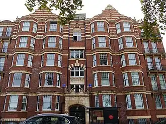 Kenilworth Court was designed by architect R. C. Overton, it was built from 1902[3] and completed by 1906.[4] The building has Dutch gables, bracketed stone balconies, stone architraves over the windows and iron railings, with 'Kenilworth Court' displayed over the entrance to each block.[5] There are 150 flat with an on site management teams[6] spread between eight mansion blocks.[7] The central courtyard had a tennis court before World War II, it was then used for growing vegetables and is now a managed garden.[8]