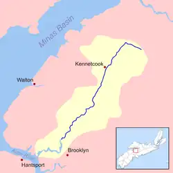 The Kennetcook River is a river that flows through Hants County, Nova Scotia. From headwaters near the mouth of the Shubenacadie River, the Kennetcook traverses about 45 kilometres of mostly rural terrain, discharging into the Avon River at Windsor. The Kennetcook cuts through fossiliferous limestone rocks for part of its length.[2] A tidal river near its mouth, the Kennetcook experiences a tidal bore which may be seen at Scotch Village.[3] It is a known salmon river popular with anglers.