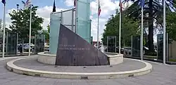 The memorial was designed by John Cohrs. It is a circular plaza, with two paths. The outer path is level while the inner path ascends to a second level. In the center is a fountain, with both granite and glass spiraling upward to a point. The inscription on the granite reads "To honor all those who served." At night, lights in the fountain reflect off of the glass in rotating colors of red, white, and blue. The fountain is also used to cover the noise of the busy Truxtun Avenue, which is directly adjacent.[1]