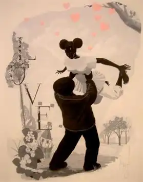 Marshall's childhood time spent in the Watts neighborhood of Los Angeles, California, where the Black Power and Civil Rights movements happened, had a significant impact on his paintings.[16] Strongly influenced by his experiences as a young man, he developed a signature style during his early years as an artist that involved the use of extremely dark, essentially black figures. These images represent his perspective of African Americans, specifically black men with separate and distinct inner and outer appearances. At the same time, they confront racial stereotypes within contemporary American society.[17] This common theme appeared continuously in his work throughout the subsequent decades, especially in the 1980s and 1990s and still appears in his most recent works.