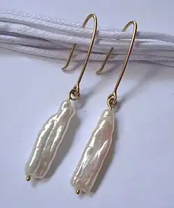 Keshi pearls are small non-nucleated pearls typically formed as by-products of pearl cultivation. A Japanese word also meaning "poppy" (ケシ, 芥子), it is used in Japanese for all pearls that grew without a nucleus. Originally, keshi pearls referred to those pearls formed when a bead nucleus was rejected. More recently, keshi has been used to refer to second harvest pearls and even to freshwater non-nucleated pearls. However the later usage referring to freshwater pearls is considered erroneous by many leading gem trade associations.[1] Because they have no nucleus, keshi pearls are composed entirely of nacre.
