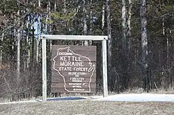 The Kettle Moraine State Forest is a state forest in southeastern Wisconsin. The chief feature of the reserve is the Kettle Moraine, a highly glaciated area. The area contains very hilly terrain and glacial landforms, such as kettles, kames and eskers. The 56,000-acre (23,000 ha)[1] forest is divided into two large and three small units, which are spread across a hundred miles.