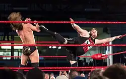 On October 11, Owens moved back to the Raw brand as part of the draft.[221] On November 23, at NXT TakeOver: WarGames, Owens made a one-off appearance as Tommaso Ciampa's mystery fourth partner for the WarGames match against The Undisputed Era (Adam Cole, Bobby Fish, Kyle O'Reilly, and Roderick Strong), which Team Ciampa won.[222] At Survivor Series the next night, Owens made up part of Team Raw in a losing effort to Team SmackDown also involving Team NXT.[223] Owens subsequently began a feud with Seth Rollins and was targeted in attacks by Rollins and his allies AOP (Akam and Rezar).[224][225][226] At the Royal Rumble on January 26, 2020, Owens entered the titular match at number 27, but was eliminated by Rollins.[227] On Night 1 of WrestleMania 36 on April 4, Owens defeated Rollins in a No Disqualification match.[228][229] At The Horror Show at Extreme Rules on July 19, Owens defeated Murphy, an ally of Rollins, on the pre-show.[230] After this, Owens entered into a program with Aleister Black,[231] trading victories until the October 12 episode of Raw, when Owens defeated Black to end their feud.[232]