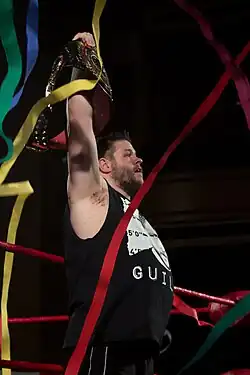 Steen began his career in 2000, at the age of 16.[3] Prior to joining WWE in late 2014, he wrestled under his birth name for Ring of Honor (ROH), where he held the ROH World Championship and ROH World Tag Team Championship.[5][6] He also wrestled extensively on the independent circuit for 14 years, most notably in Pro Wrestling Guerrilla (PWG), where he held the PWG World Championship a record three times, as well as the PWG World Tag Team Championship on three occasions.[7][8] Steen also competed for International Wrestling Syndicate (IWS), where he held the IWS World Heavyweight Championship three times, and Combat Zone Wrestling (CZW), where he held the CZW Iron Man Championship.
