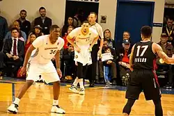 UCLA rarely called plays for Looney, and his scoring typically came off putbacks, fast breaks, and open shots.[31][32] A natural rebounder, Looney's shooting improved as the season progressed. After making just nine of 28 of his three-point field goals in the first 24 games, Looney was 11 of 17 in the last seven games of the regular season.[19] Still his scoring tapered off, with only one game over 15 points since his career-game at Stanford.[31] In the 2015 Pac-12 tournament, Looney exited mid-game after he took an arm to his left cheek during UCLA's quarterfinal win over USC. He was a game-time decision to play the next day against Arizona, when Looney was cleared and fitted with a protective mask 90 minutes before the contest. Though impaired by the mask, Looney played 30 minutes but was limited, finishing below his season averages with only five points and four rebounds.[33][34][35] The Bruins lost 70–64, but the close match helped them secure a bid into the 2015 NCAA tournament.[36] Looney continued to play wearing the mask as UCLA advanced to the Sweet 16 for the second straight season.[37]