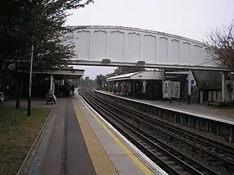 The footbridge to the south of the station is also noteworthy and is Grade II-listed in its own right.[10][11] The railway line bisected Kew, but it was not until 1912[10] that the bridge was provided to allow residents to cross the tracks safely (previously, a level crossing was used, with the added disadvantage of delaying trains). It is a rare surviving example of a reinforced concrete structure built using a pioneering technique devised by the French engineer François Hennebique.[17] The bridge has a narrow deck and very high walls, originally designed to protect its users' clothing from the smoke of steam trains passing underneath. It also has protrusions on either side of the deck to deflect smoke away from the bridge structure.[18] It was restored in 2004[19] with a grant from the Heritage Lottery Fund, in a project led by The Kew Society.[18] In July 2017, concerns were expressed about the structural safety of the bridge.[20]