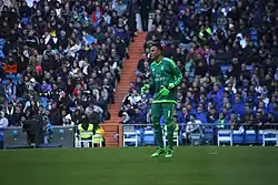 On 3 August 2014, Real Madrid triggered Navas' €10 million buyout clause,[30] and he signed a six-year contract with the club.[31] His first competitive call-up was on 12 August, sitting on the bench as Iker Casillas played in the 2014 UEFA Super Cup, which Real Madrid won 2–0 against Sevilla at the Cardiff City Stadium.[32] Navas was given his debut for the club on 23 September, in a 5–1 victory over Elche at the Santiago Bernabéu.[33] He was given his Champions League debut on 26 November, keeping a clean sheet in a 0–1 away win against Swiss side FC Basel.[34] On 20 December, he was on the bench as his team won the Club World Cup, defeating Club Atlético San Lorenzo in the final in Morocco.[35] His performances for Levante in the previous La Liga season and Costa Rica in the 2014 World Cup led him win Player of the Year at the 2014 CONCACAF Awards,[36] earning the dual distinction of the first Costa Rican and goalkeeper to do so.