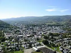 According to the U.S. Census Bureau, the city has a total area of 1.92 square miles (4.97 km2), all land.[13] It is situated in a valley on the south side of the North Branch of the Potomac River at its junction with New Creek. New Creek forms most of the eastern boundary of the town. On the immediate eastern bank of New Creek is New Creek Mountain, peaking at 1,552 feet above sea level on the eastern side of Keyser (though the long mountain itself has higher peaks far south of Keyser). On Keyser's western edge is the Allegheny Front, rising 2,631 feet above sea level at this point along its range. The northern edge of Keyser is bounded by the North Branch of the Potomac River. Immediately across the river, in McCoole, Maryland, another portion of the New Creek Mountain ridge features a massive outcropping of Oriskany or Ridgeley sandstone known as Queens Point, a popular cliff from which to take in views of Keyser. The cliff is approximately 400 feet above the river.[14] The southern edge of Keyser is not bound by geology, as the valley here stretches farther south than the city limits. Beyond its southern limits is the unincorporated community of New Creek.