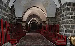 Khan Dannun was originally a large khan ("caravansary") completed in 1376 by the Mamluk governor of Damascus, Manjak al-Yusufi,[4] during the reign of the Bahri Mamluk sultan al-Ashraf Sha'ban.[5] The khan was designed by Ali ibn al-Badri, known as muhandis ash-Sham ("engineer of Damascus.")[6] The name "Dan nun" is the colloquial version of "Dhul-Nun,"[7][8] a highly venerated 9th-century Muslim figure. He is considered to be the early patriarch of the Sufis.[7] Khan Dannun became a stopping point on the hajj ("pilgrimage to Mecca") caravan route after al-Kiswah, and before Ghabaghib.[9]