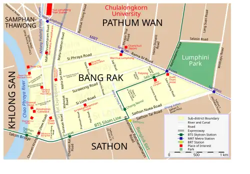 The district's main thoroughfares, in addition to Rama IV and Sathon roads, which serve as its borders, are Charoen Krung Road, which runs roughly alongside the river, and (from north to south) Si Phraya, Surawong and Si Lom roads, which run in a southwest–northeast direction, roughly parallel to Sathon, linking Rama IV and Charoen Krung. They divide the district into five subdistricts (khwaeng). Bang Rak Subdistrict is on the riverside west of Charoen Krung. East of it, from north to south, are Maha Phruettharam, Si Phraya, Suriyawong, and Si Lom. Together, they have a registered population of 48,227 as of 2019.[1]