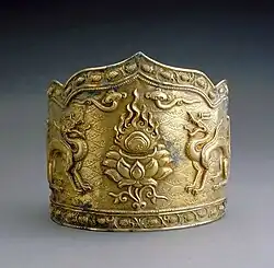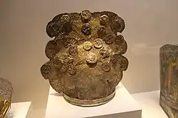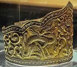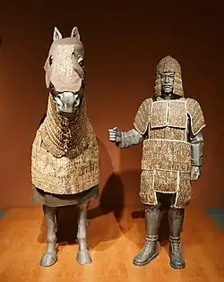 There were eight Khitan tribes: the Xiwandan, Hedahe (Adahe), Fufuyu (Jufufu), Yuling (Yuyuling), Rilian, Piqie (Pilier), Li (black), and Tuliuhan (Tuliuyu).[22] The eight tribes shared power by rotating leadership triennially.[23] The Khitan federation presented tribute to the Northern Yan (409–436), which in return invested the Khitan khan as Prince Guishan. The Khitans also regularly presented tribute to the Northern Wei (386–534) court in the form of horses and animal skins. Trade occurred on the border in Helong (modern Chaoyang) and Miyun. In 553, the Khitans suffered a defeat to the armies of Northern Qi (550–577) and lost a large portion of their population as well as cattle. For a time they resided in Goguryeo.[24] In 584, they submitted to the Sui dynasty (581–618). In 605, they were attacked by the Türks and lost 40,000 men and women.[24] The eight tribes of old dispersed. Only two Khitan leaders are known from this period: Hechen and Wuyu. The title of Khitan chieftains was Mofuhe or Mohefu.[24]