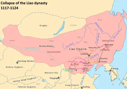 During his reign, Abaoji attacked numerous neighboring peoples and expanded Liao territory exponentially. Against the steppe nomads, he led campaigns in 908 against the Shiwei, in 910 the Kumo Xi, in 912 the Zubu, in 915 the Khongirad, and again in 919 to subdue the Khongirad.[61] From 922 to 923, he raided the Jin and its successor, Later Tang.[62] A year later he attacked the Tatars.[63] His campaigns continued right up until his death in 926 with the conquest of Balhae and the creation of the puppet Kingdom of Dongdan.[64] Most of Balhae's population was relocated to what is now Liaoning. The destruction of Balhae resulted in three independent groups beyond Khitan control: the northwestern Balhae people in modern Heilongjiang, the Balhae people west of the Yalu River, and the state of Jeongan in the upper valley of the Mudan River that emerged after the dissolution of Dongdan.[65][66]