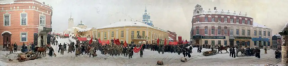 On the eve of the February Revolution, there was no particular aggravation of the social and political struggle in Vyatka province and Vyatka. The October revolution of the Bolsheviks in Petrograd was declared illegal, the provincial governorate remained loyal to the Provisional Government.[25]