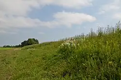 These places seem to have held exceptional significance in ancient times, as evidenced by the vast number of burial mounds in the vicinity. Especially notable is the area of Hrubsk, where researchers counted 684 mounds there. In Hrubsk, in addition to numerous mounds, there are 4 ramparts with moats, which are fairly well preserved. One of them, 6 to 7 sazhen high, forms a circle enclosing an area of up to 300 square sazhen, creating a kind of citadel. It has a moat nearby, with a single entrance leading inside. Local residents claim that during the first Tatar invasion of Kyiv, about 40,000 people from the surrounding areas fortified themselves in this location, but all were killed after a short siege. Supposedly confirming this legend, coins contemporary with the Tatar invasions were found in Hrubsk, including a broad silver groschen minted in Prague, depicting the Bohemian king Wenceslaus I of Bohemia, who reigned from 1230 to 1253.[8]