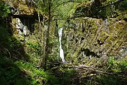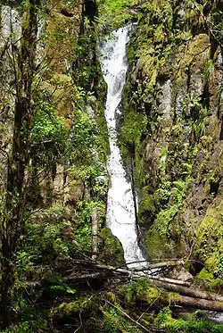 Ki-a-Kuts Falls stands 40 feet (12 m) tall and travels down a narrow rock chute in a single cascade over basalt cliffs.[1][2] They end in a pool of water at the base, with views obscured by trees.[2] Views are further obscured by a bend in the river at that point, which helped keep the falls concealed behind cliffs and thus unnoticed by modern explorers and off of maps.[2] The falls are located 1,700 feet (520 m) upriver (west) of the Tualatin River’s confluence with Maple Creek and 1.4 miles (2.3 km) north of Barney Reservoir at an elevation of 1,299 feet (396 m).[1] This is west of Henry Hagg Lake and the city of Gaston and about 3.5 miles (5.6 km) east of the county line with Tillamook County within the Tillamook State Forest.[1]