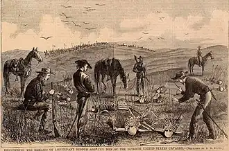 When Kidder's men spotted the twelve approaching Dog Soldiers, they raced off at a gallop in search of a defensible position and soon dismounted and sought shelter in a depression. The Dog Soldiers circled the soldiers, shooting at them while the Oglala men, arriving shortly after and fighting in Lakota fashion, dismounted and approached the soldiers on foot. According to Cheyenne accounts, the Lakota scout Red Bead, who was with the soldiers, called out to his fellow tribesmen to be spared, but his pleas went unheeded by the enraged warriors who considered him a traitor.[1] Two of the circling Cheyenne warriors, Tobacco and Good Bear, exposing themselves to the fire of the soldiers, had their ponies shot from under them whereas two Oglala warriors were killed in the fight. One of them was Yellow Horse, who had been made a chief just shortly before.[1] According to the eyewitnesses the fight lasted only a short time.[1] All members of the Kidder party were killed, and the Lakotas scalped and ritually mutilated them to render them unable to fight in the afterworld by smashing in their skulls, slashing the sinews of their arms and legs, cutting off their noses as well and then filling every dead body with arrows. Red Bead was scalped as well but his scalp thrown into the dust next to him in a gesture of contempt for scouting against his fellow tribesmen.[1]