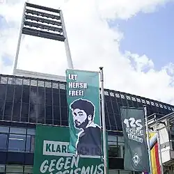 Goldberg-Polin was an avid fan of the German football club SV Werder Bremen. Both the team and its fans took up Goldberg-Polin's cause. Within three weeks after his abduction, fans of the team held up a large green banner reading "Always together" in Hebrew. They also held heart-shaped signs with name of the hostages. In July 2024, the club hoisted a green banner with Goldberg-Polin's picture along with the words "Let Hersh Free" outside their home stadium.[47] Following news of his death, the club released a statement expressing its condolences.[48]