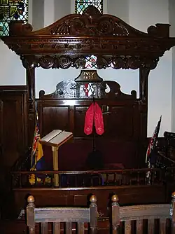 The church has some magnificent fittings, pride of place going to the elaborately detailed Crawford Loft of circa 1705, and to the 17th-century sounding board above the pulpit. Many of the windows have been decorated in stained glass.