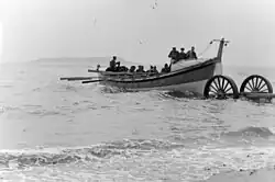 A boathouse was constructed on the beach at Kildonan, at a cost of £201, and a 32-foot 10-oared self-righting 'Pulling and Sailing' (P&S) lifeboat, one with oars and sails, and costing £247-9s, was sent to the station. The lifeboat and launch carriage were transported to Ardrossan in early May 1870, by both the London and North Western, and Glasgow and South Western railway companies, the latter providing their services for free.[4][5]