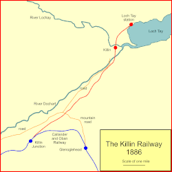 On 1 June 1870, the Callander and Oban Railway opened the first portion of its line. Shortage of cash meant that the original intention of linking Oban to the railway network was to be deferred for now. The line opened from the former Dunblane, Doune and Callander Railway at Callander to a station named Killin, but it was at Glenoglehead, high above the town and three miles (5 km) distant down a steep and rugged track.[1]