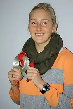 Martin made her international debut for Sweden at the 2001 Women's World Championship, when she was 15 years old. She played in two games, as Sweden finished fifth.[5] She also played for Sweden at the 2002 Winter Olympics, helping them to a third-place finish as a surprise starter for the bronze medal game against Finland. Martin was selected as the starter for the medal game by a coin toss.[6] Martin also suited up for Sweden at the Women's World Championships in 2004, 2005, 2007, and 2008, capturing bronze medals in 2007 and 2009.[5]