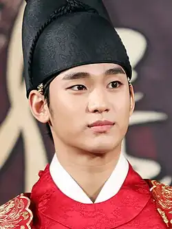 Kim's popularity skyrocketed when he starred in the hit period drama Moon Embracing the Sun as the King Leehwon.[28] The drama recorded a peak rating of 42.2 percent,[29] thereby earning the "national drama" status and was exported to locales across Asia, making it one of the most profitable exports in the drama genre.[30] Kim contributed his vocals to the soundtrack with the traditional ballad "Only You"[31] and the more modern composition "Another Way".[32]