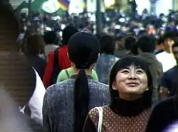 In 1999, Kimsooja presented her most iconic work: A Needle Woman,[1] a performance video piece that premiered at CCA Kitakyushu and further evolved in subsequent showings as a multi-channel video projection.[12] In A Needle Woman, the artist is seen with her back facing the camera, wearing precisely the same clothes and standing precisely the same way in various metropolises:[30][31] Tokyo, Shanghai, Delhi, New York, Mexico City, Cairo, Lagos, London, Patan, Nepal (1999–2001); and in a second series of performances: Havana, Cuba; N’Djamena, Chad; Rio de Janeiro, Brazil; Sana’a, Yemen; and Jerusalem (2005).[12] Some locations visited in the work are places of violence, disrepair, or unresolved conflict, lending to the needle a metaphoric function as an instrument of healing.[31] Also in A Laundry Woman (2000), a performance video piece shot in India, Kimsooja is seen immobile and standing in front of a river where debris seemingly drift. A Needle Woman and A Laundry Woman exposed the artist's stances on non-doing and immobility as a form of art practice; specifically, lending to the action of immobility the virtue of inverting an audience's linear perception of space and time.[31] The first version of A Needle Woman presented the artist laying horizontally on a rock and it established nature and spatial orientation as a central subject in her work. As well, her use of the Korean color spectrum (Obangsaek), in which each color stands for a cardinal direction in Korean tradition, took up great importance.[32]