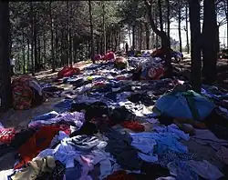 In Kimsooja's first video performance, Sewing into Walking-Kyungju (1994), Kimsooja is seen atop the valleys of Gwangju (formerly spelled Kwangju), South Korea, picking up scattered bedcovers on the valley's floor and wrapping them into a bundle. A year later, Kimsooja returned to the valley for the first Gwangju Biennale in Korea and scattered various clothes made of traditional Korean fabrics on the ground of a forest. This installation, made of 2.5 tons of second-hand clothes and entitled Sewing into Walking- Dedicated to the victims of Kwangju, commemorated the victims of the suppression of a democratic protest in Gwangju in 1980. This work established an analogy between the structure of fabric and that of the land, which was of particular importance in terms of confirming the three-dimensionality and spatial topology of fabric in Kimsooja's work, as well as establishing her body in performance as a needle that weaves through the fabric of humanity and nature.[26]