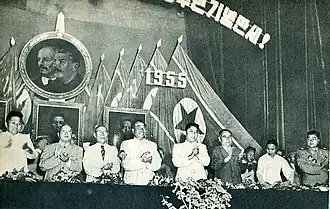 From left to right: Pak Chang-ok, Li Jishen, Kim Tu-bong, Zhu De, Kim Il Sung, Averky Aristov, Pak Chŏng Ae, and Choe Yong-gon in 1955.