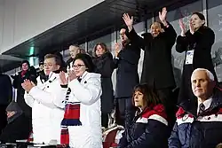 On 9 February 2018, Kim attended the 2018 Winter Olympics opening ceremony in Pyeongchang, South Korea. This was the first time since the Korean War that a member of the ruling Kim family had visited South Korea.[31] She met with South Korean President Moon Jae-in on 10 February and revealed that she was dispatched as a special envoy of Kim Jong Un. She also delivered a personally written letter from Kim to Moon.[32] Kim was later part of her brother's team during the 2018 North Korea–United States Singapore Summit[33] and the 2019 North Korea–United States Hanoi Summit. Her involvement in diplomatic affairs continued as she issued an official statement in March 2020 from her capacity as first deputy department director of the party.[34]