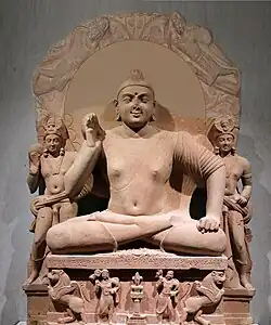 The Kimbell seated Bodhisattva is a statue of a "bodhisattva" (probably the Buddha after his renunciation of princely life, but before his Enlightenment) from the art of Mathura, now in the Kimbell Art Museum in Fort Worth, Texas. The statue is dated to 131 CE, by an inscription recording its dedication in "Year 4 of the Great King Kanishka", since the date of the beginning of Kanishka's reign is thought to be 127 CE.[4] The Kimbell seated Bodhisattva belongs to the category of the "Seated Buddha triads", which can be seen contemporaneously in the Greco-Buddhist art of Gandhara and in the art of Mathura in the early Kushan period.[5]