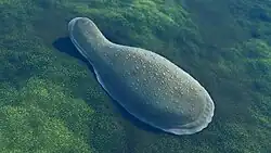 Kimberella is an extinct genus of marine bilaterian known only from rocks of the Ediacaran period. The slug-like organism fed by scratching the microbial surface on which it dwelt in a manner similar to the gastropods,[3] although its affinity with this group is contentious.[4][5][6]
