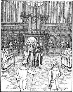 By 1449 recruitment had resulted in this full choir being in place singing daily services. The choir sang High Mass, Lady Mass and from daybreak, the eight services of the Liturgy of the Hours. In addition the boys alone sang daily "in the finest manner they know" the Little Office of the Blessed Virgin Mary and also the evening votive antiphon.[3]
