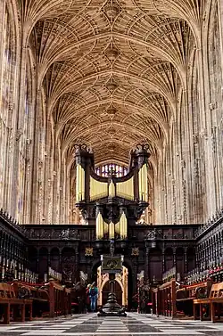 King's College Chapel is the chapel of King's College in the University of Cambridge. It is considered one of the finest examples of late Perpendicular Gothic English architecture and features the world's largest fan vault.[3] The Chapel was built in phases by a succession of kings of England from 1446 to 1515, a period which spanned the Wars of the Roses and three subsequent decades. The Chapel's large stained glass windows were completed by 1531, and its early Renaissance rood screen was erected in 1532–36. The Chapel is an active house of worship, and home of the King's College Choir. It is a landmark and a commonly used symbol of the city of Cambridge.[4][5]