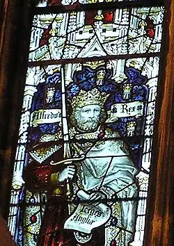 This is also the period in which almost all chroniclers agree that the Saxon people of pre-unification England submitted to Alfred.[68] In 888, Æthelred, the archbishop of Canterbury, also died. One year later Guthrum, or Athelstan by his baptismal name, Alfred's former enemy and king of East Anglia, died and was buried in Hadleigh, Suffolk.[69] Guthrum's death changed the political landscape for Alfred. The resulting power vacuum stirred other power-hungry warlords eager to take his place in the following years.