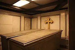 On 24 November 1859, the king suffered a stroke that paralysed his left side.[73] Since he was no longer able to be transported, the court remained at Sanssouci. On 4 November 1860, he lost consciousness after another stroke, and on 2 January 1861 he died. In accordance with his testamentary instructions from 1854, the King was buried in the Friedenskirche in Potsdam after his heart had been removed and buried separately alongside his parents in the mausoleum in Charlottenburg Palace Park.