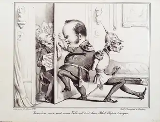 As a result of the concessions, liberals initially overlooked the fact that Frederick William IV was not of one mind with them.[19] The King intended his policy of reconciliation to restore trust in a medieval-feudal relationship of loyalty between the Prussian people and the monarch, making the liberal reform of the state along the lines of the French constitutional-parliamentary model superfluous.[20] He believed that he derived his close ties to his people from the divine right of grace, which gave him a "sacred insight into the needs of his subjects".[21] Any restriction of his de facto absolutist power seemed to him to be an irresponsible obstruction of his divinely ordained mission.[22]