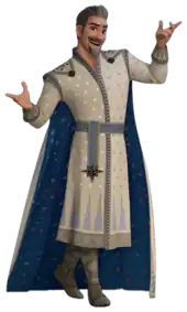 According to The Art of Wish, King Magnifico is the only Disney villain, except for Prince Hans in Frozen (2013), to be designed in off-white clothing instead of black or dark colours. Schwab said that he was designed to convey an imposing physical presence and elegant figure. His features were created with a triangular form to accentuate his handsomeness and perfect hair. The animators drew inspiration from actors, athletes and public figures for Magnifico's appearance and his design went through numerous changes during the design process. Various experiments around the character's appearance included decisions over whether he would have a beard, if he would have brown or white hair and how to decorate his robe. His final design reflects the formal architecture of his kingdom. The designers used vertical, elongated shapes inspired by medieval architecture found in buildings and sculpture such as cathedrals. His costume was inspired by medieval and nineteenth century illustrations. In addition, his robe was decorated with stars, while his jacket features the elements of fire, water, earth and air and also the zodiac signs.[3]