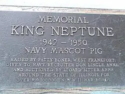King Neptune (1941–1950) [sic] Buried here — King Neptune, famous Navy mascot pig auctioned for $19,000,000.00 in war bonds 1942–1946 to help make a free world.[12]