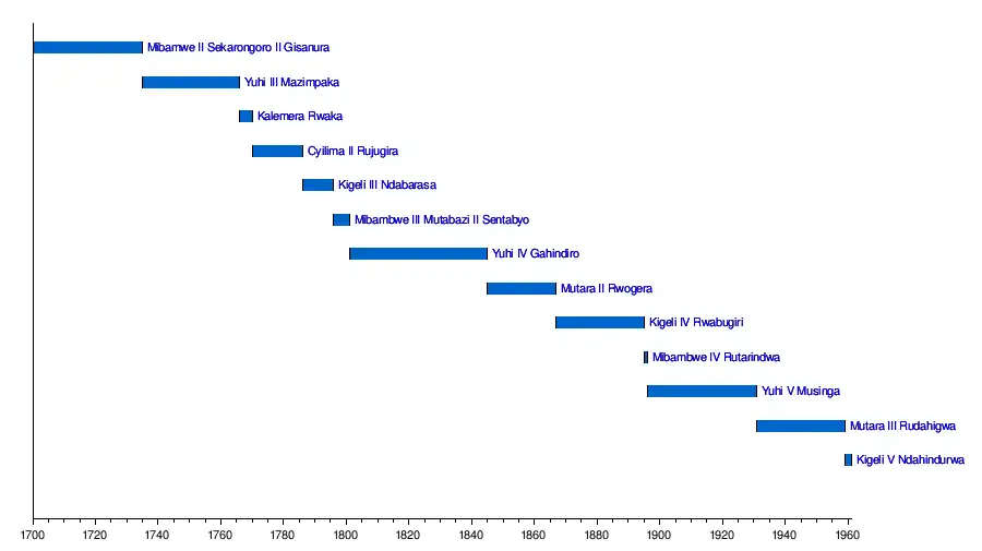 | Yuhi III Mazimpaka | 1735–1766 | c. 1696–1720 | Enumerated as Yuhi II . | |